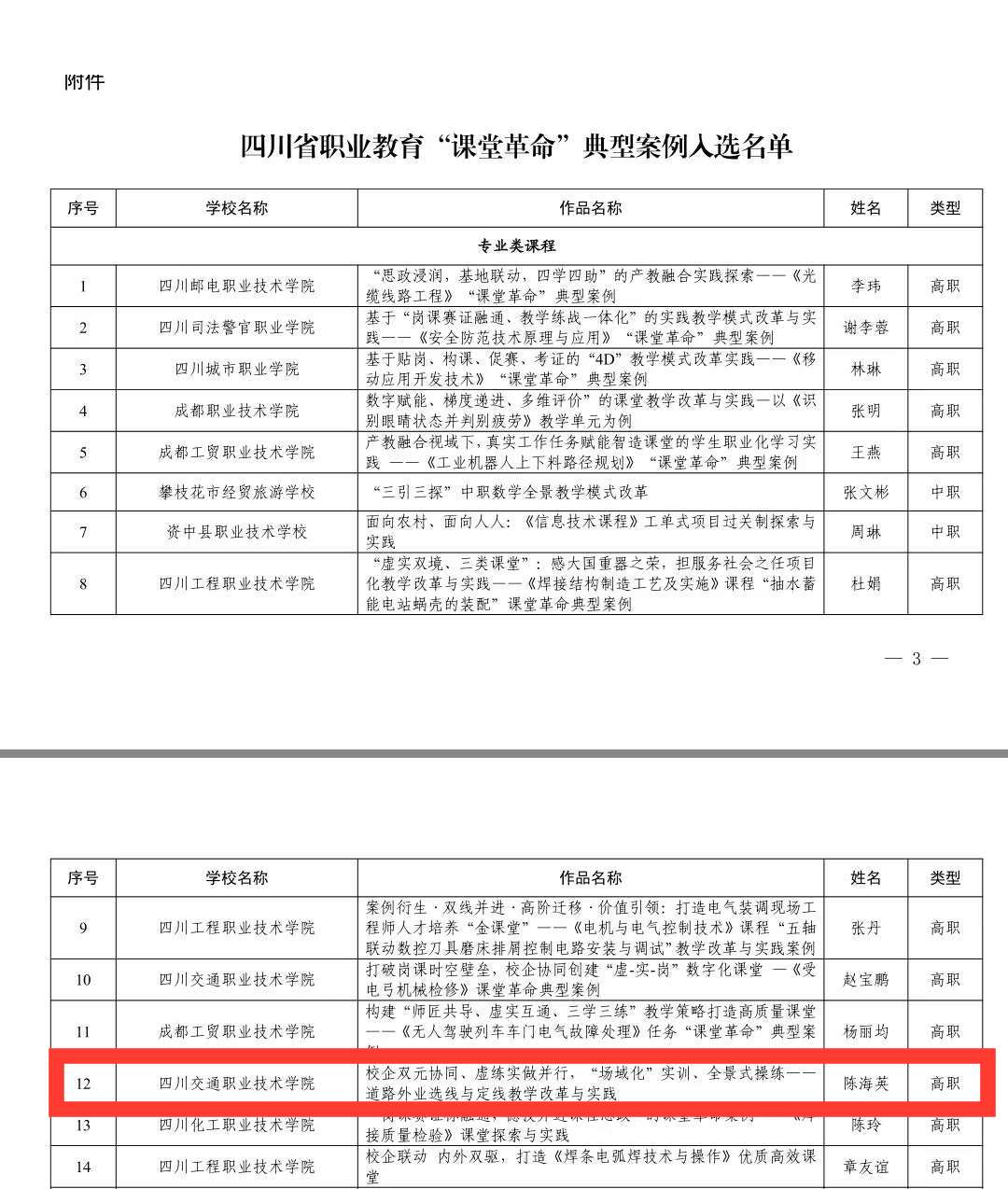根据《四川省教育厅关于开展职业教育“课堂革命”典型案例评选工作的通知》要求,在各地各校推荐申报的基础上,经形式审查、专家评审、网上公示,道路与桥梁工程系陈海英老师团队“校企双元协同、虚练实做并行,‘场域化’实训、全景式操练——道路外业选线与定线教学改革与实践”案例成功入选四川省职业教育“课堂革命”典型案例。