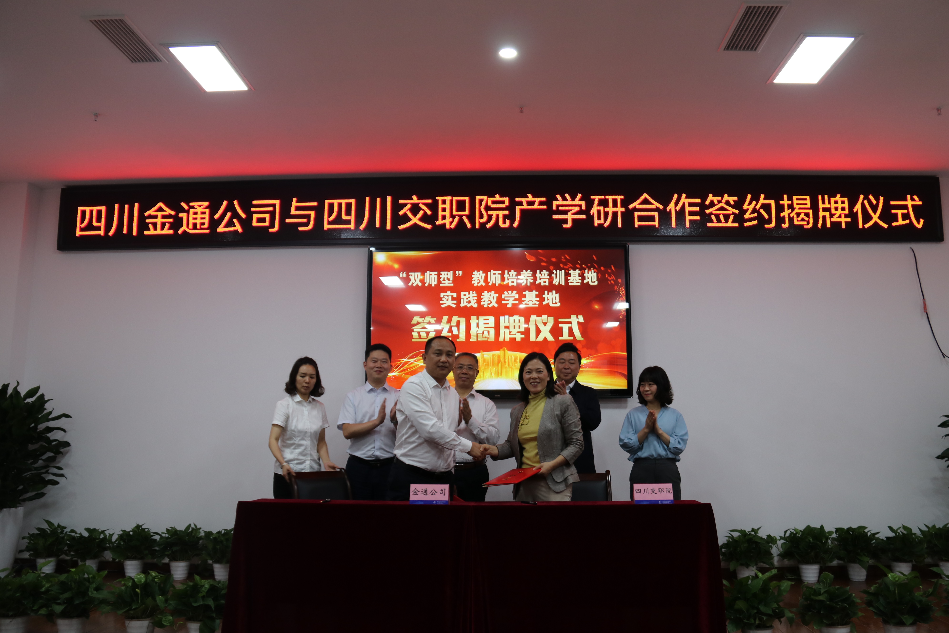 四川金通公司党支部书记、执行董事、总经理赵丹,副院长刘玉荣代表双方正式签署了《产学研合作暨“双师型”教师培养培训基地、实践教学基地战略合作协议书》,明确了合作宗旨、合作内容、保障机制等若干事项。随后,进行揭牌仪式,正式开启双方在深化产学研合作、协同培育人才、共建实训基地、共担科研项目等方面合作大门。