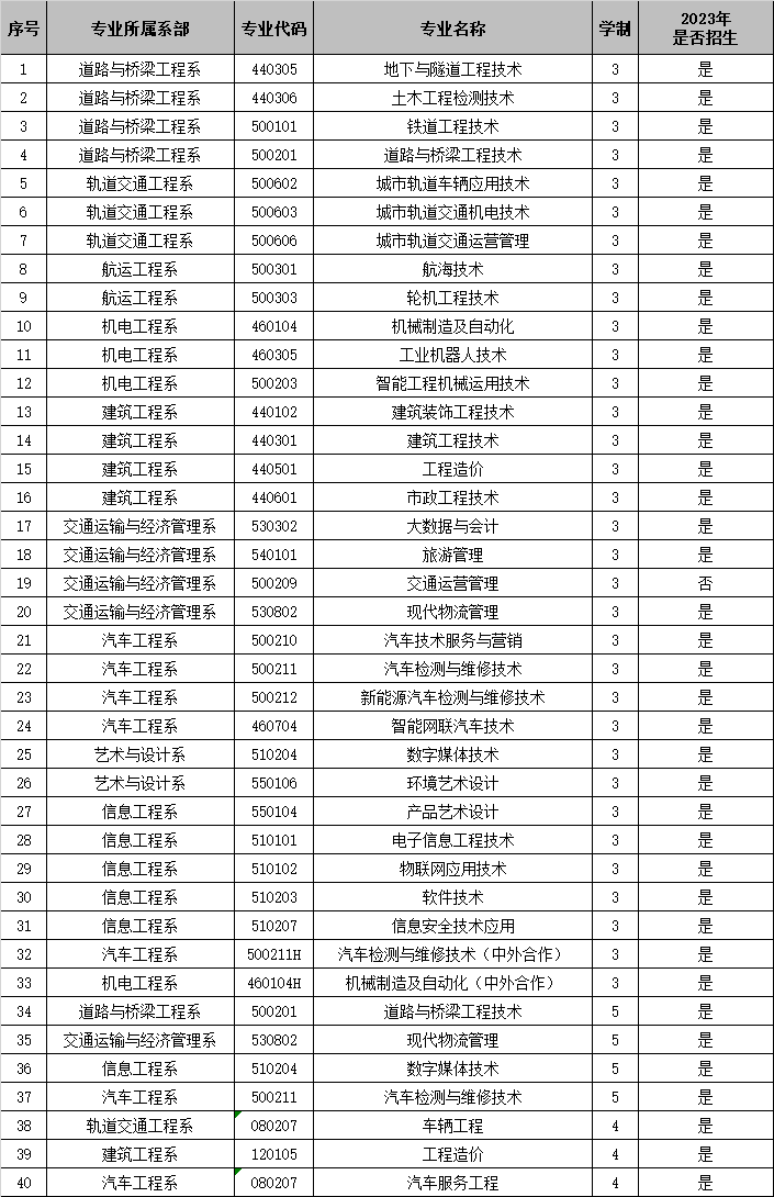 学院现有11个二级教学单位,由9个教学系和公共课教学部、马克思主义学院组成。2023年,开办招生专业40个,其中三年制高等职业教育专科专业33个(含2个中美合作办学专业),五年制专业4个,职教本科专业3个,学院各系及专业分布情况如表1所示,当年停招专业5个,如表2所示。