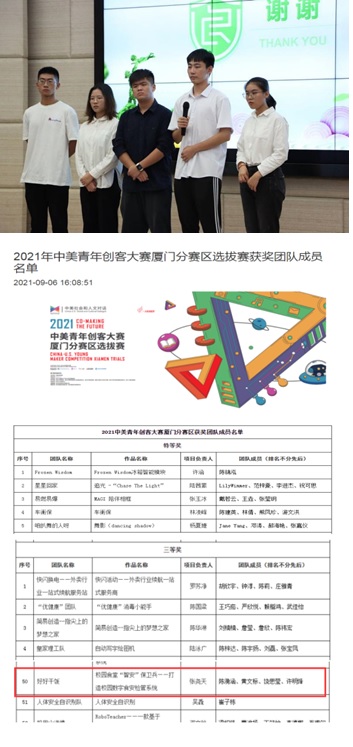 本次2021中美青年创客大赛厦门赛区参赛报名人数 1590 人,团队数 360,成功提交项目数 196 项,覆盖学校 77 所。经初赛和决赛两轮评审,共评出特等奖6项(其一为中美联合队伍),一等奖10项,二等奖16项,三等奖53项。