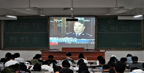 为形成宣传、学习安全知识的校园氛围,培养、增强学生的安全防范意识,打造平安校园,贝博官网组织开展安全知识教育活动。2019年11月29日晚,在诚信楼中阶梯三教室组织同学们收看“守规则、除隐患,安全文明出行”122系列专题片。