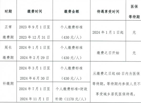 参保缴费期限为2023年9月1日至2024年2月29日,待遇享受期限为2024年1月1日至12月31日,其中2024年1月1日至2024年2月29日缴费的,从缴费到账次日开始享受医保待遇。