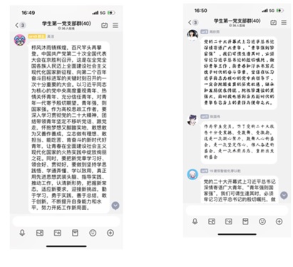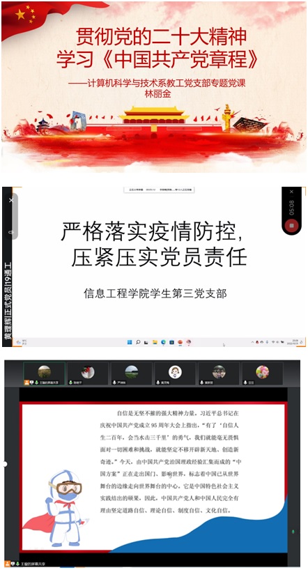 因疫情防控启动线上教学以来,贝博官网党委带领各党支部开展党的二十大精神线上专题学习、集体研讨、专题报告、微党课、主题党日活动等灵活多样的线上学习活动7场。各支部在学习中能够深刻解读党的二十大的核心要义和丰富内涵,认真学习党章,并结合当前面临的防疫形势,引导广大师生正确把握“坚持人民至上、生命至上,坚持动态清零不动摇”的防疫政策,号召广大师生以更坚定的意志、更昂扬的斗志投入到抗疫工作中。学院再次启动疫情期间教师党员志愿者线上教学督导,成立了3支学生党员志愿服务队,协助进行心理疏导、场外核酸检测引导和日常秩序维持等,充分发挥基层党组织坚强战斗堡垒和党员先锋模范作用,为维持学院良好线上授课秩序保驾护航。