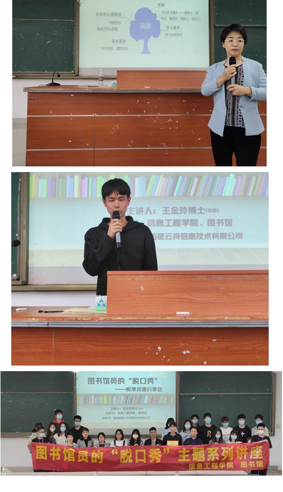 在分享会上,王金玲博士分享了图书馆馆藏资源建设情况,着重介绍了图书馆公众号、中国知网和超星学习通等内容,并演示了图书馆公众号功能及网络电子资源检索技巧。随后,贝博官网部分学生分享了图书阅读心得体会,赢得了同学们阵阵掌声。分享会最后,校图书馆馆长林琼老师和贝博艾弗森代言体育官网党委书记应永胜老师为“书香信工”第一季阅读达人进行表彰并颁发荣誉证书。
