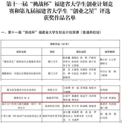 由团省委、省教育厅、省人社厅、省科协、省学联联合举办,阳光学院、共青团福州市委承办的第十一届“挑战杯”福建省大学生创业计划竞赛已落下帷幕,贝博官网参赛项目《健康先生Mr.H》荣获银奖。